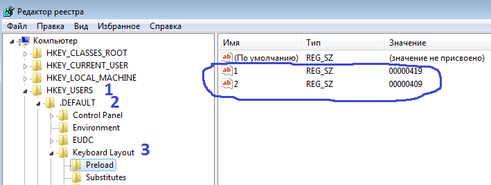 3.2 Вносим изменения в ветке реестра :\HKEY_USERS\.DEFAULT\Keyboard Layout\Preload\ , значения в ветке-1 меняем 419 меняем на 409, значение в ветке-2 меняем 409 на 419.